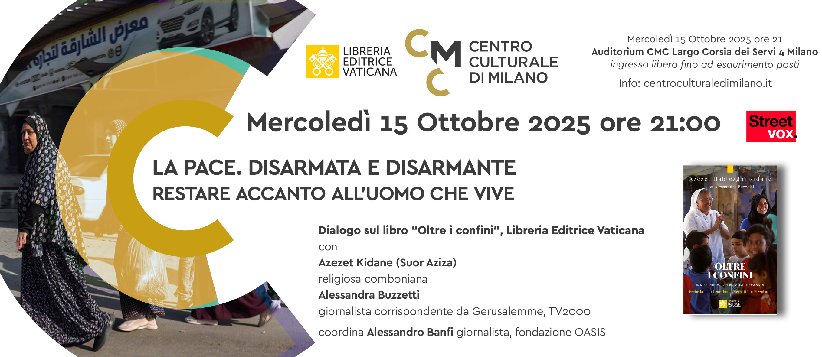 Mercoledì 15 ottobre l’ultimo appuntamento, alle ore 21.00, a Milano, organizzato con il Centro Culturale di Milano, sarà un dialogo fra suor Azezet Kidane, Alessandra Buzzetti in diretta da Gerusalemme, e il giornalista Alessandro Banfi. L’incontro si svolgerà nell’Auditorium CMC (Largo Corsia dei Servi, 4).